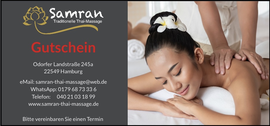 Wir freuen uns darauf, dich bei in unseren Shop bei Samran Traditionelle Thai-Massage persönlich begrüßen zu dürfen, wo Entspannung und Wohlbefinden im Mittelpunkt stehen!
