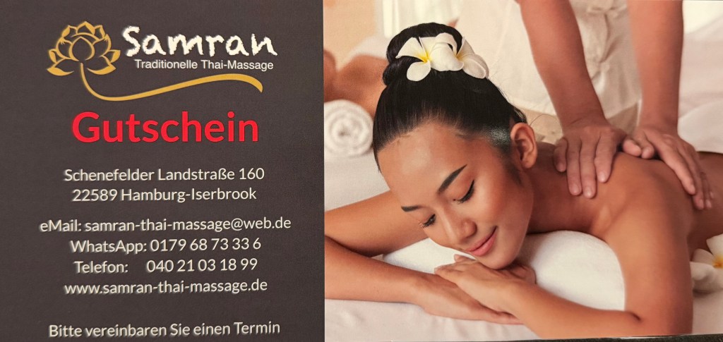 Wir freuen uns darauf, dich bei in unseren Shop bei Samran Traditionelle Thai-Massage persönlich begrüßen zu dürfen, wo Entspannung und Wohlbefinden im Mittelpunkt stehen!